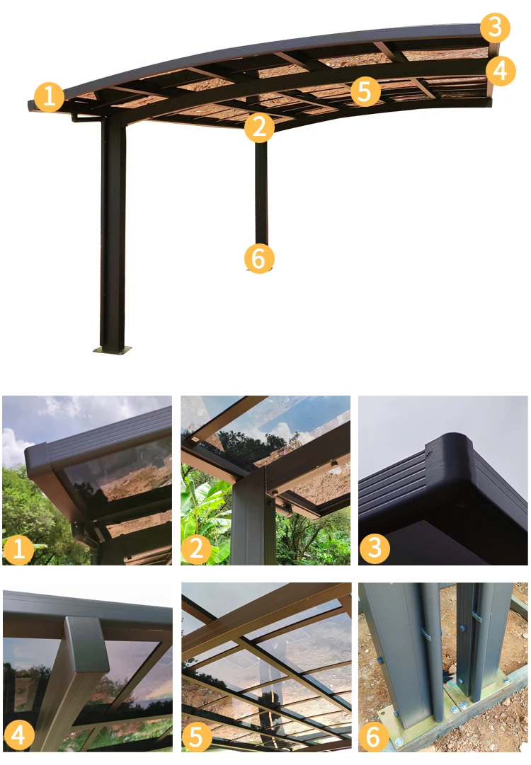 1>. Canopy material: 2.0mm grade A solid polycarbonate sheet (10 year warranty) 2>. Frame material: 1.3-4.0mm all-aluminium with surface electrostatic powder coated (rot-proof) 3>. Snow load: 600N/m, max snow thickness can be 20-35cm. Wind resistance: 50m/s. 4>. Accessories: a. Aluminum alloy stud with surface electrostatic powder coated b. Drain-pipe c. Screws for installation, etc
