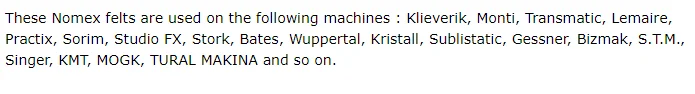 Calender Heat Press Felt is used on a heat transfer printing calender. Synthetic fabrics are usually printed on this calender using high temperatures (up to 230°C / 450°F). The pre-printed paper carries the dyestuffs, which are then sublimated on the fabric using high temperature.