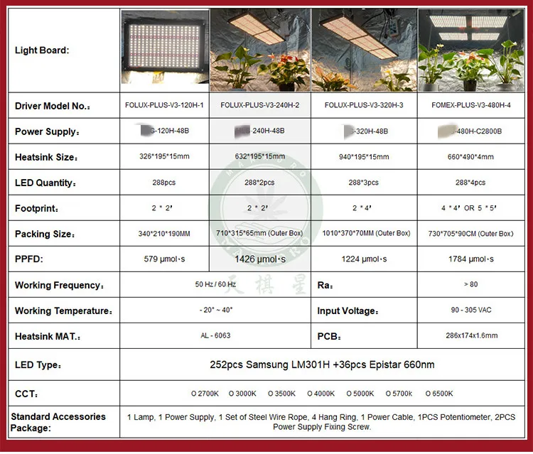 FOLUX-PLUS-V3-480H-4 (480w) each kit include: 1. 4pcs high effiency lm301H 288v3 plus board with epistar 660nm 2. 1pc heatsink 660x490x4mm 3. 1pc meanwell driver 480w 4. metal hanger, plug wire, hang rings.