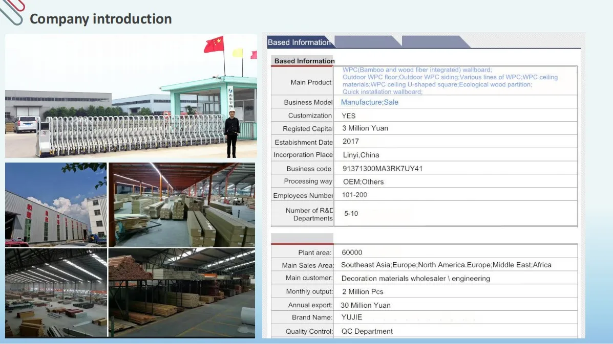 Shandong Yujie Machinery built in 2005,15 years of experiences,we are professional in wpc products,especially wpc wall panels,wpc decking floor.particle board machine line.we can help plan your factory.we only manufacture good quality machines.