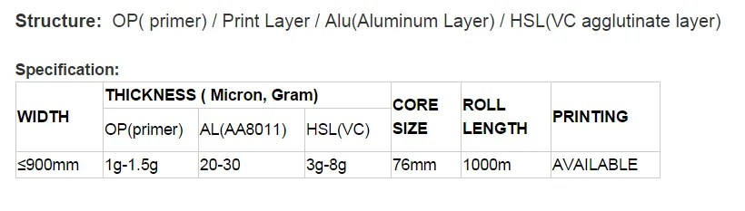 Structure: OP( primer) / Print Layer / Alu(Aluminum Layer) / HSL(VC agglutinate layer)