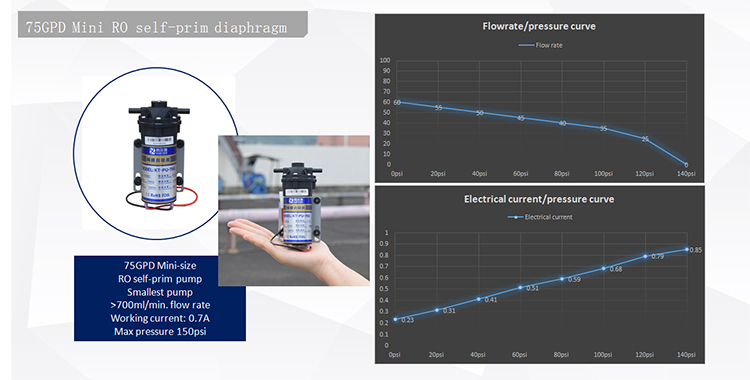 A1: The diaphragm pump is specially chosen for RO system because it does not require constant working for the pump, and the working process is controlled by the pressure change and water flow change from the water supply side to the treated water side. The diaphragm pump works by using the motor part to generate power and water flow to the water chamber of the pump head, the deliver water with enhanced pressure for the RO membrane, the diaphragm pump is taken as the heart of the RO system to provide running power.