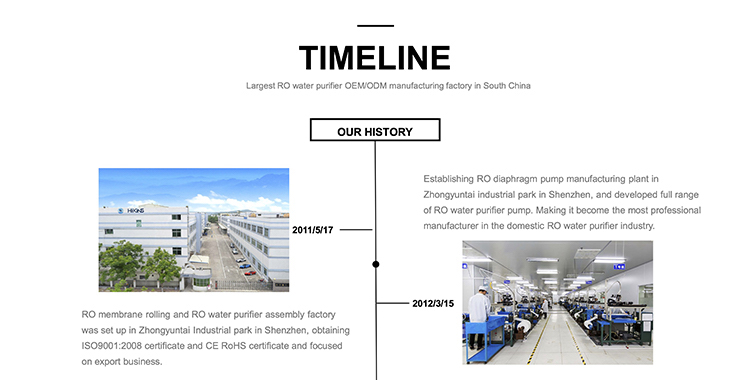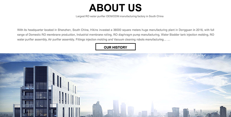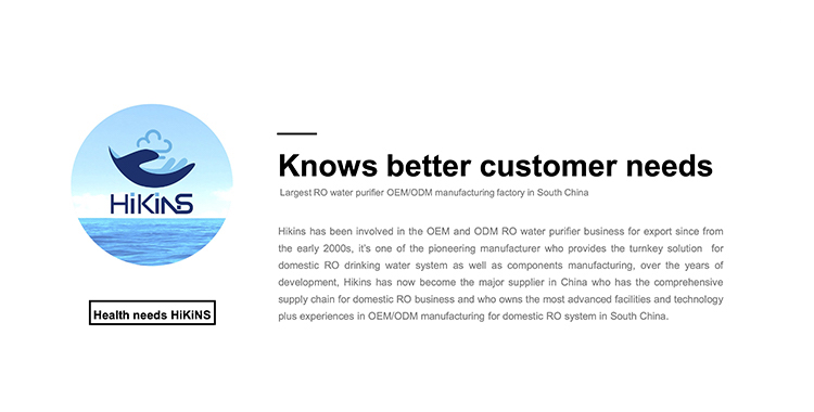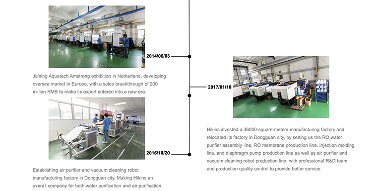 Hikins manufactures full range of RO booster pump from 50GPD to 1000GPD for domestic RO water purifier application, Hikins diaphragm pump is further categorized into self-priming pump with feed water pressure from 0psi, and regular booster pump with feed water pressure from 20psi, the RO pump is widely selected for domestic Reverse Osmosis membrane application, and it is fully tested and meeting the relevant RO membrane permeate flow rate. Hikins has special advantage in injection and tooling production equipment for the plastic parts manufacturing, Hikins also has its own copper windering assembly line for the motor core production.