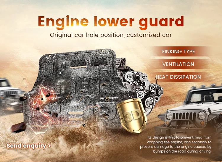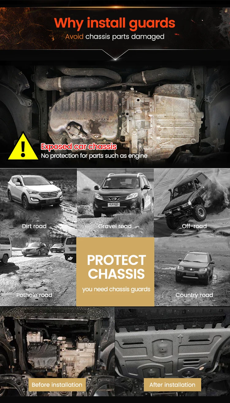 Function | Protect auto engine | Thickness | Aluminum alloy material: 2.5mm~4.0mm Iron material: 1.4mm~3.0mm |