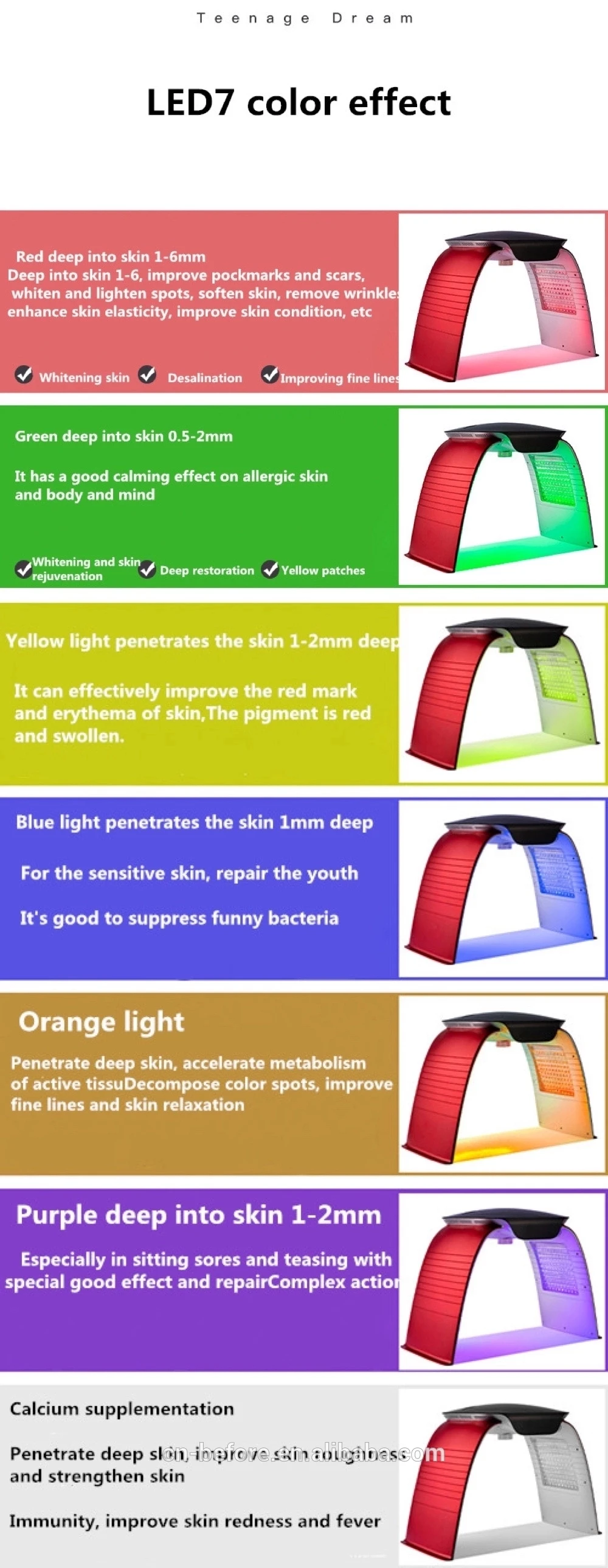 1. LED SYSTEM is a phototherapy machine which professional focuses on increase skin tissue synthesis of collagen and elastin fibres, to produce healthier, faster healing, younger looking and glowing skin. 2. LED technology that generates photons at different frequencies to penetrate into deeper layers of tissue. Different wavelengths (colors blue, green, red) of light will have different effects on the skin. 3. LED SYSTEM with Multi functions which is recommended for improving oily skin, removing marks and excess pigmentation, diminishing wrinkles, skin flaccidity, expression lines and orange-peel skin, for firming skin, treating localised adiposity and for whitening teeth.