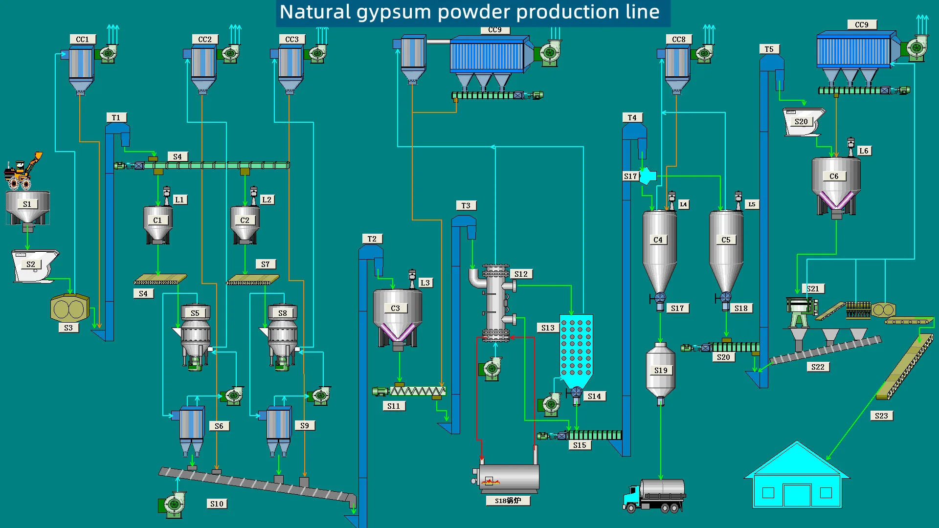 * 2 Possess fine calcination, cooling and homogenization, gasification and aging technologies;According to the performance of raw materials and later products in different regions, individualized design is adopted to save energy by more than 20% and energy-saving equipment can save power consumption by 15-20%. * 3 The production line adopts DCS automatic control technology, with a high degree of automation, stable quality and labor saving. * 4 The whole line is operated under negative pressure and the dust removal adopts a three-stage dust removal system. The exhaust emission after treatment is less than 30mg/m³and the environmental protection meets the environmental protection standards of various regions. * 5 Non-standard standardized production ensures the equipment quality of the entire production line, complete anti-corrosion and heat preservation measures; Optimize the technical indicators of each stand-alone equipment; The application equipment of the production line is in line with the characteristics of gypsum production; * 6 Professional installation, training and debugging team; Short installation period for the whole line and original production line calcination “0” debugging cost, saving a lot of investment for new enterprises.