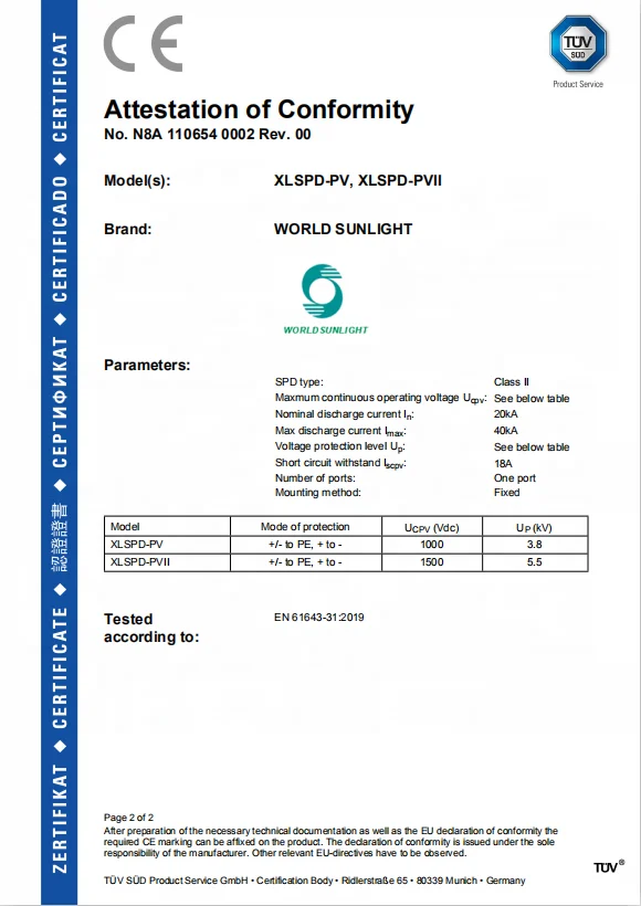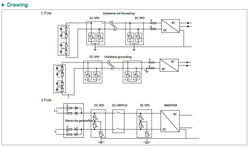 XSPD surge protective device, protect against lightning surge voltages in solar system (photovoltaic power supply system).These units must be installed in parallel on the DC networks to be protected and provide common and different modes protection. Its installed location are recommended at both ends of the DC power supply line (solar panel side and inverter/converter side), especially if the line routing is external and long.High energy MOVs equipped with specific thermal disconnectors and related failure indicators.