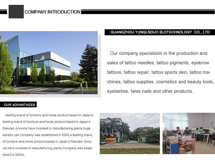 1. who are we? We are based in Guangdong, China, start from 2017,sell to Domestic Market(10.00%),South Asia(10.00%),Northern Europe(10.00%),Central America(10.00%),Eastern Asia(10.00%),Mid East(10.00%),Africa(10.00%),Southeast Asia(10.00%),South America(10.00%),North America(10.00%). There are total about 5-10 people in our office. 2. how can we guarantee quality? Always a pre-production sample before mass production; Always final Inspection before shipment; 3.what can you buy from us? Tattoos,nail enhancements,eyelashes,beauty 4. why should you buy from us not from other suppliers? Guangzhou yunqinduo Biotechnology Co., Ltd. is a company specializing in the production and processing of tattoo needles, tattoo colorants, eyebrow tattoos, tattoo repair, tattoo exercise skins, tattoo machines, tattoo supplies and other products. |