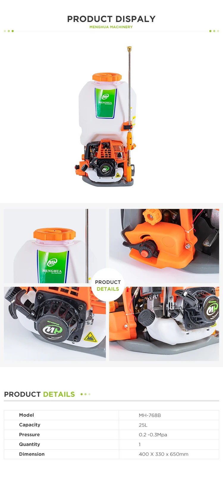 TAIZHOU Menghua Machinery Co., Ltd. is founded in 1991, Menghua Machinery, a scientific and technological enterprise with an integration of R&D, manufacture and sale, has been adhering to the operation philosophy of Never Break a Promise and taking customers and products as the core since its birth. In Menghua Machinery, we control every detail to explore precision technology infinitely, cherish customer interests with our spirit of concentration and provide professional mechanical and electrical solutions for customers in different fields. We manufacture more than 200 kinds of mechanical and electrical products of 8 series including power sprayers, knapsack sprayers, garden machines, engines, gasoline and diesel generators, gasoline water pumps, vibration pumps and mowers. The products are popular and well-received in more than 160 countries and regions in the world.