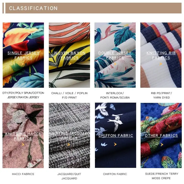 A:Rayon jersey fabrics, cotton jersey fabrics, polyester jersey fabrics, knitted jacquard fabrics, ribs, hacci, frenchterry, rayon challis, rayon poplin, rayon voile etc. and so on.