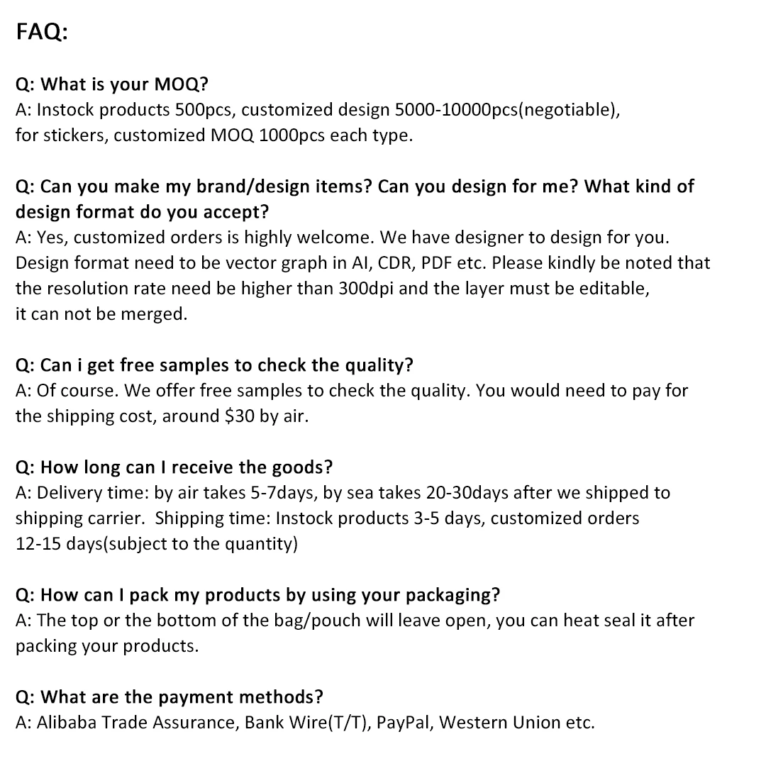 * Welcome custom your own logo; We also have many printed labels to choose. Kindly contact us for more details.
