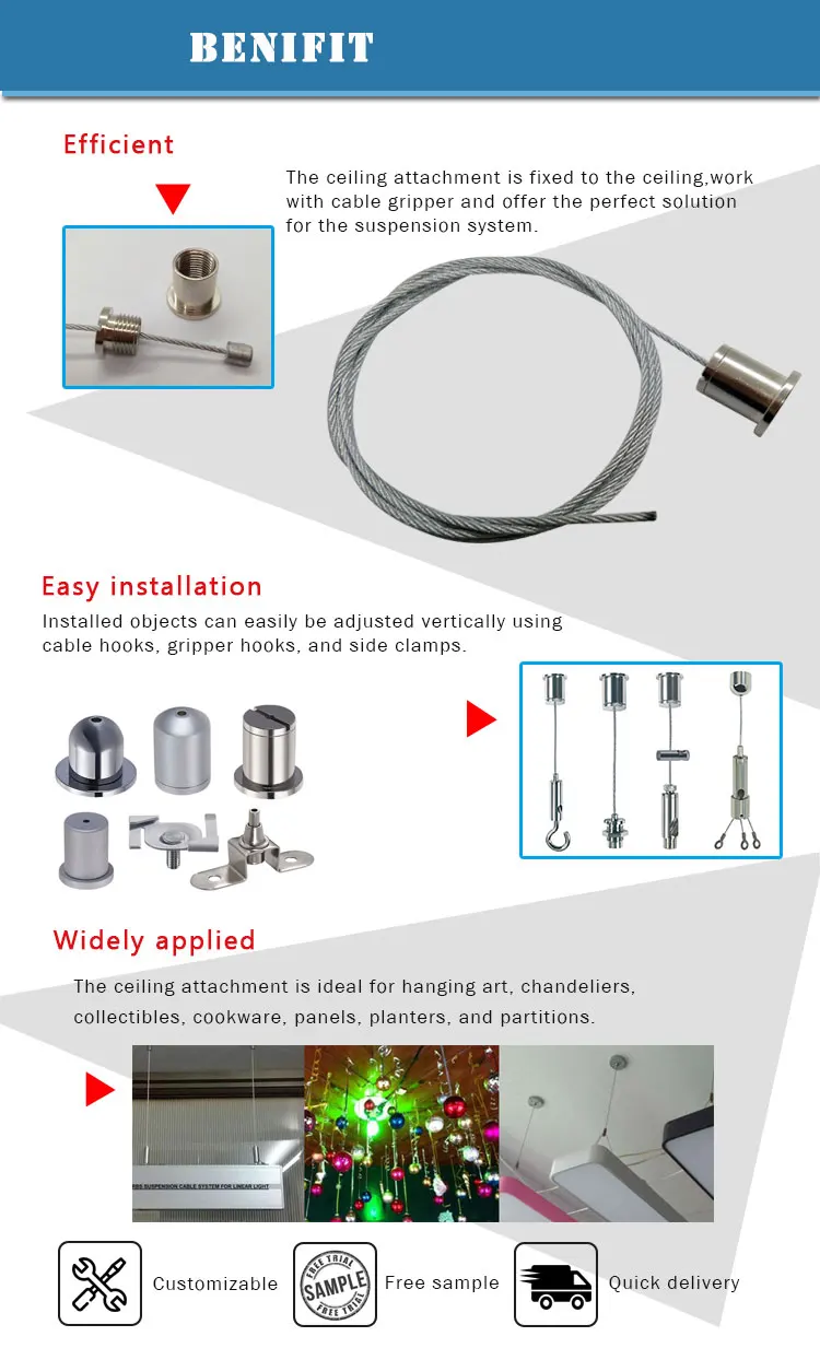 We have to know your application firstly and a number of factors have to be considered, such as work load, safety abrasion,environment ,cycle life, flexibility, cost, When we design the ceiling suspension cable /kits .