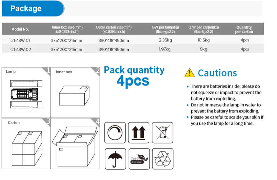Mode | T21-01(12pcs 18650 batteries) | T21-02(4pcs 18650 batteries) |