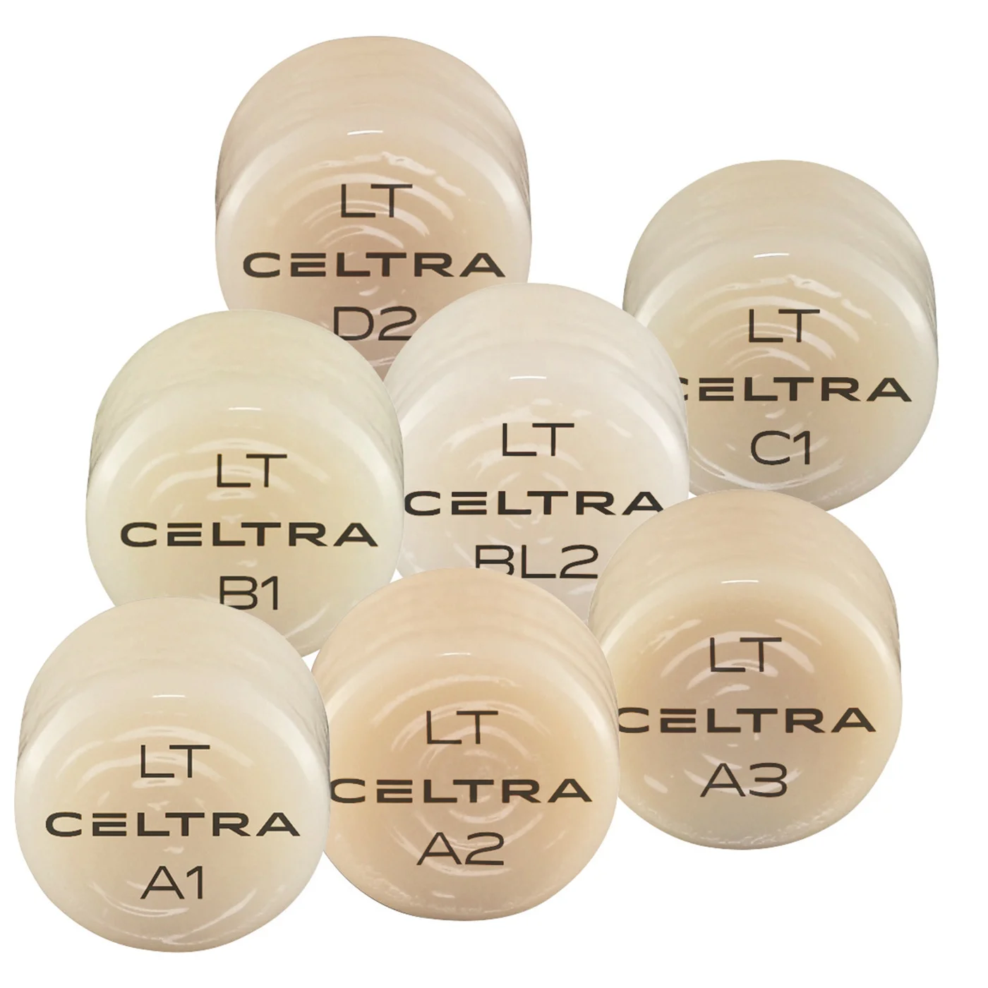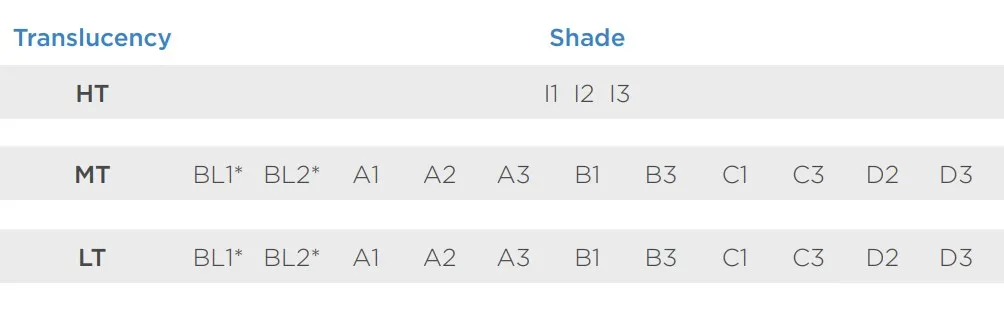 Made from ZrO2 reinforced lithium-silicate ceramic (ZLS) with micro structure. Can be veneered with Celtra Ceram veneering porcelain and characterised with Dentsply Sirona universal stains. Advantages: -Chameleon-effect for an optimum visual matching in vivo; -Perfect balance of translucency and opalescence; -Natural opalescence for less intraoral greying; -High tensile strength of more than 500 N/mm² for reliable results; -Outstanding quality of the margins – more reliability also in complex cases; -Very good flow properties due to smaller ZLS micro crystals, only one press sprue for a three-unit bridge; -Simple and more accurate selection of blanks, few shades cover a huge part of the colour spectrum; -The correct shade already in the blank, hardly any adjustments in hue, colour brightness and saturation required; -Self-adhesive or full-adhesive luting, depending on the indication. Physical data: -CTE 9.7 x 10⁻⁶K⁻¹ (25-500 °C); press temperature 860-870 °C; softening temperature 820 °C; glass transition temperature 560 °C; flexural strength after PowerFire firing > 500 N/mm²; chemical solubility < 30 µg/cm².