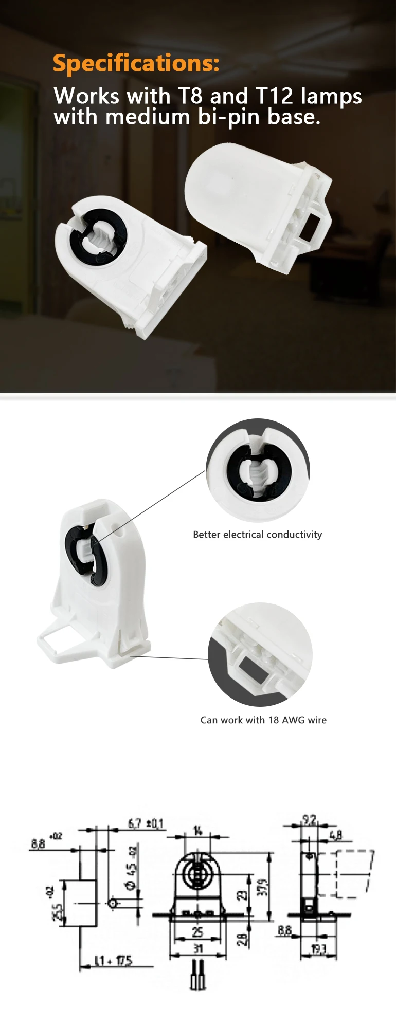 Feature: "Specifications: Works with T8 and T12 lamps with medium bi-pin base.Great for retrofitting your fluorescent fixtures to LED tubes, replacing old florescent lamp holders and more. High quality: Made from high quality fireproof PC, the T8 lamp holders are heat resistant and 100% safe from fire hazard, durable even after years of use. Advantage: Easy to Use: Get your project done in minutes with T8 Lamp Holder Socket Tombstone with 10” 18 AWG Wire. Just connect the wires (not included), plug the tube in and twist, a plug-and-play solution for your lighting projects. Wide Application: Perfect for anywhere from home, office, basement, closet to studio that needs a lighting retrofit, while staying low profile between the T8 lights.".