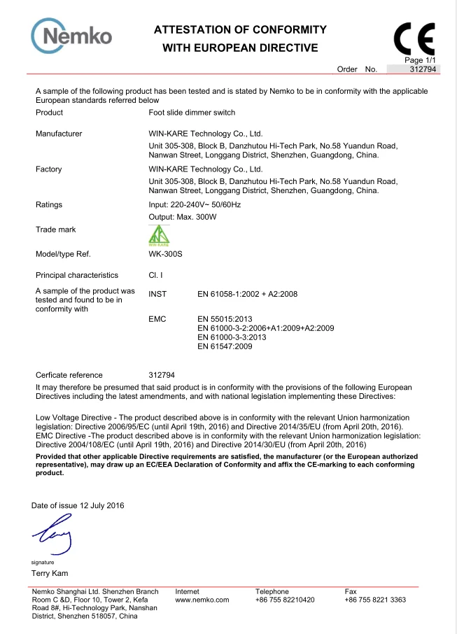 Product Name | WK-300S EU Standard 220-240v Foot Slide Dimmer Switch |