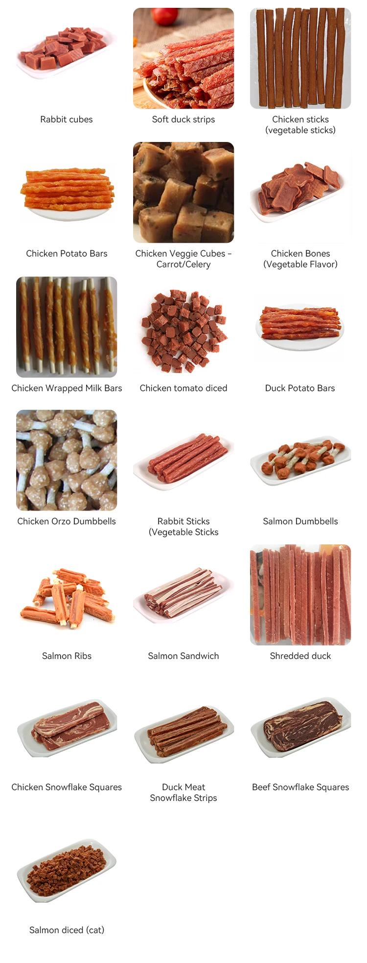 Flavors | 1. Chicken strips 2. Shredded chicken 3. Chicken slices 4. Soft shredded chicken 5. Duck strips 6. Duck slices 7. Beef stick 8. Chicken wrapped around white calcium bone 9. Chicken wrapped around the original color cowhide stick 10. Chicken dumbbells 11. Chicken sushi 12. Chicken Sushi Roll 13. Chicken Sandwich 14. VC beef cake 15. Shredded beef 16. Shredded salmon 17. Beef puree wrapped around white calcium bone 18. Chicken Wrap Fries 19. Rabbit cubes 20. Soft duck strips 21. Chicken sticks (vegetable sticks) 22. Chicken Potato Bars 23. Chicken Veggie Cubes - Carrot/Celery 24. Chicken Bones (Vegetable Flavor) 25. Chicken Wrapped Milk Bars 26. Chicken tomato diced 27. Duck Potato Bars 28. Chicken Orzo Dumbbells 29. Rabbit Sticks (Vegetable Sticks) 30. Salmon Dumbbells 31. Salmon Ribs 32. Salmon Sandwich 33. Shredded duck 34. Chicken Snowflake Squares 35. Duck Meat Snowflake Strips 36. Beef Snowflake Squares 37. Salmon diced (cat) | ||||