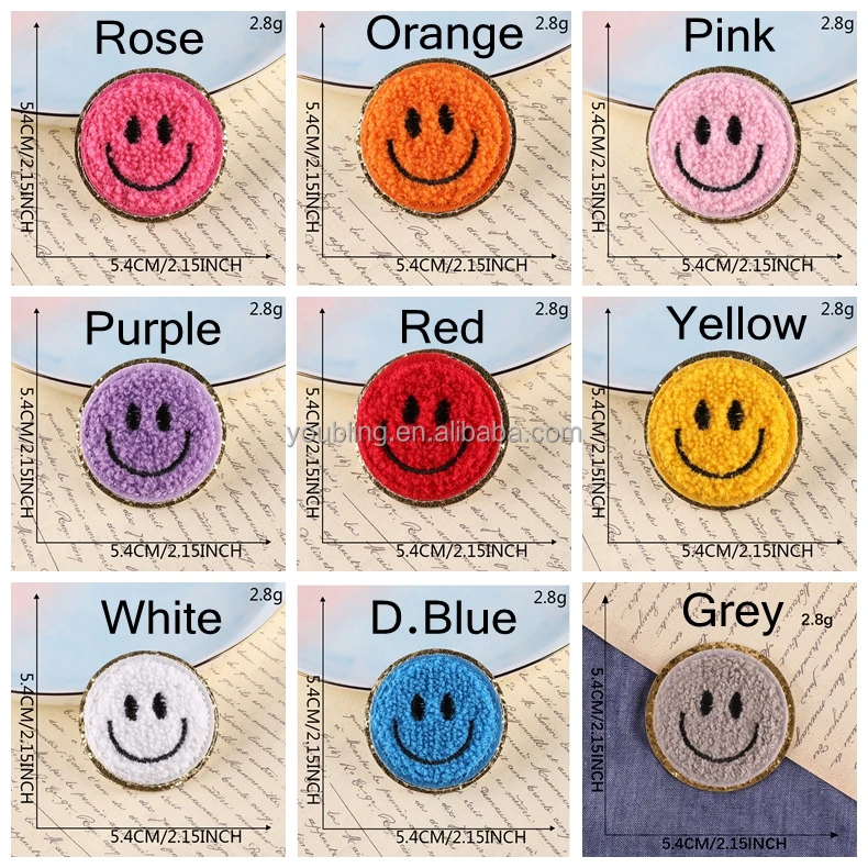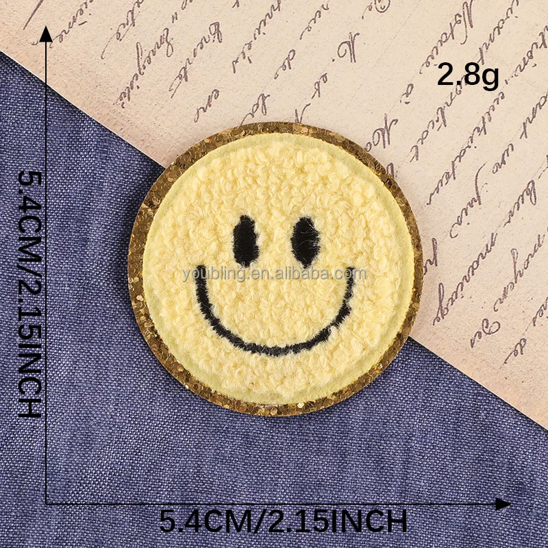 Production Name | Mix Color Wholesale 5.4CM Smile Face Cloth Stickers Decorative Glitter Smile Face Chenille Iron on Patches for Clothing Use |