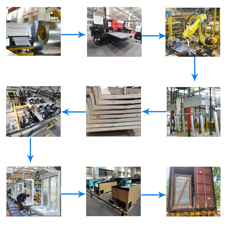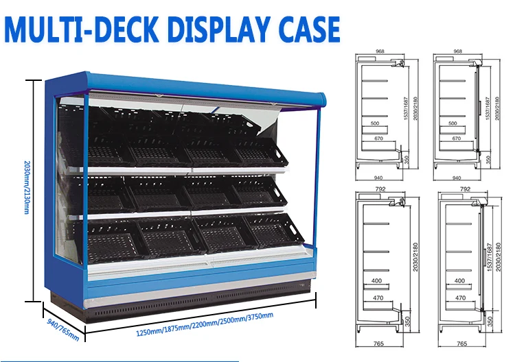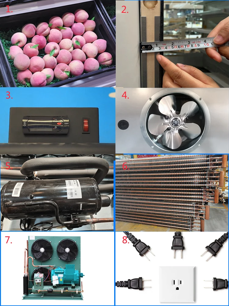 1.Thickened fruit and vegetable basket. 2.Foam thickness of rear back plate 3 cm 3.Controller optional. 4.EBM fan. 5.Refrigerant:R404A、R448A、R454C optional. 6.All condensers use copper pipes. 7.Various brands of units are available. 8.380V/220V/110V 、50HZ/60HZ optional.