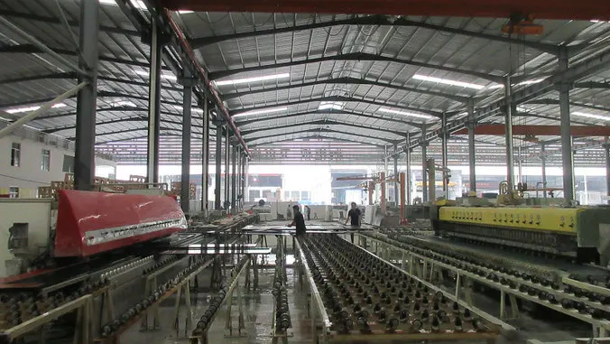 Main equipment includes 9 diamond saws, 1 Italian 16-head mill, 1 Italian 8-head roughing machine, 1 Taiwan 20-head mill, 1 Taiwan 16-head mill, 3 boardglue-adding lines, 1 set of stacked stereoscopic vacuum drying glue-adding lines, and 15 cranes. The monthly output is 100,000 sqm.
