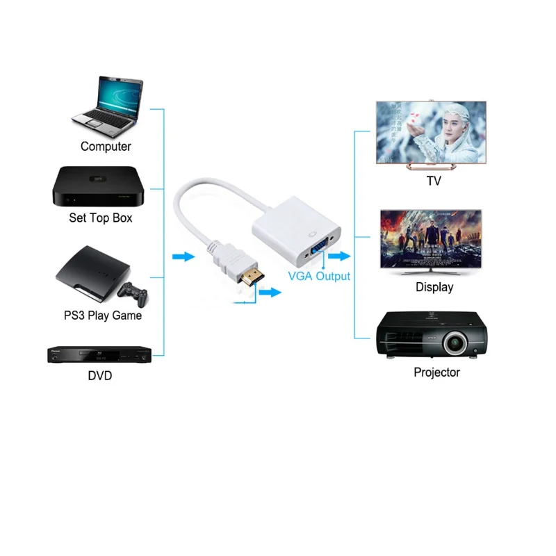 This HD to VGA adapter allows you to connect an HD output from your laptop, ultrabook, or desktop computer onto a VGA monitor or projector, saving the cost of upgrading to an HD compatible display. Intended for outputting user generated content such as presentations, and work documents. Product Name:HD Male to VGA Female Adapter Connector A:HD Male--connects to your laptop,computer,desktop or tablet Connector B:VGA (1 x 15 pin female)--connects to an existing VGA cable connected to your monitor or projector Connector Plating:24K Gold Plated Material:Black&White ABS Shell+ PVC Wire Jacket Cable Length:25CM Wire Gauge:Oxygen Free Copper Conductor, 30AWG,OD:6.0mm Sheilding:Aluminum-Mylar Braid Package:Standard Polybag,Paper Box, Blister Box, Gift Box Warranty:12Months | ||||||||