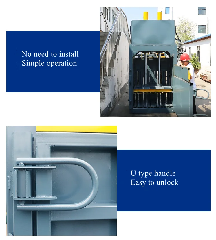 It's widely applied for compressing various waste materials: old clothes, textile, straw, waste plastic, waste newspaper, used cardboard, waste paper plate, waste carton box, cotton, wool, yarn, woven bags, wool hemp, plastic bag, etc. Hydraulic lifting chamber door improves the work efficiency, conveniently for packaging and the tight crossed tying.