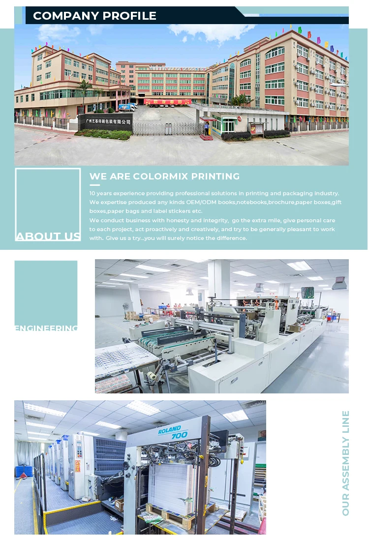 We are a manufacturer in the printing & packaging area for more than 12 years. Right now we have more than 300 workers in our factory in Guangzhou. Our products comply with ISO9001:2008 and BV. We are the AAA grade enterprise in China.