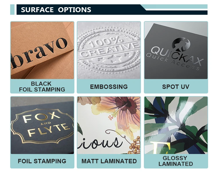 Finish | 1) Glossy/Matte lamination 2) Complete or Spot UV 3) Embossing and Debossing 4) Gold or silver foil stamping 5) Varnishing | |||||