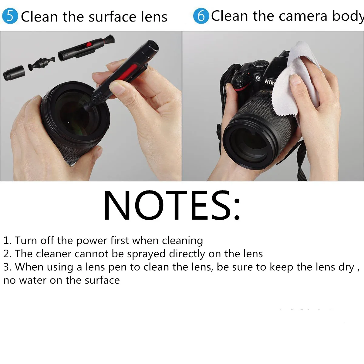 * 1 x Air blower * 1 x Double sided lens pen * 2 x Cleaning brush * 1 x A empty bottle * 1 x Lens cloth * 1 x Lens cleaning paper *6 x Cotton swab * 5 x dry cleaning wipes/wet cleaning wipes * 1 x Storage bag