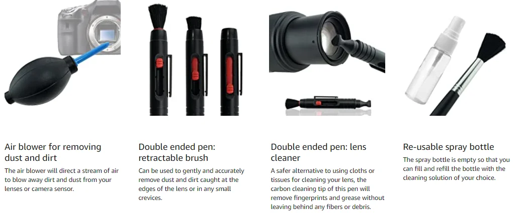 * 1 x Air blower * 1 x Double sided lens pen * 2 x Cleaning brush * 1 x A empty bottle * 1 x Lens cloth * 1 x Lens cleaning paper *6 x Cotton swab * 5 x dry cleaning wipes/wet cleaning wipes * 1 x Storage cylinder