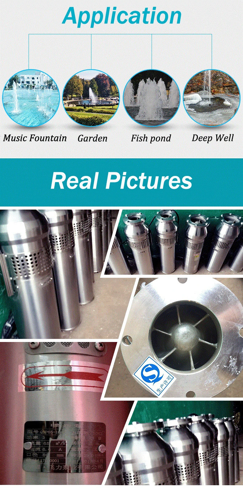 1) QSP fountain pump has automatic water filling function, the motor is self-circulation water filled motor. 2) All QSP fountain pump use a stainless steel filter, can prevent big size sundries inside. 3) Use cast iron/cast stainless steel materials for whole QSP fountain pump, more durable 4) The special material of impeller can prevent impeller loosing during working 5) With earth leakage protection device, use fixed potential grounding device to make sure safety during operation. 6) After researching and testing of QSP fountain pump based on common pumps, we improved the raw material of pump and motor parts to make sure our QSP fountain pump can work perfectly even frequent starting, now all QSP fountain pump are certainly designed for Music Fountains.