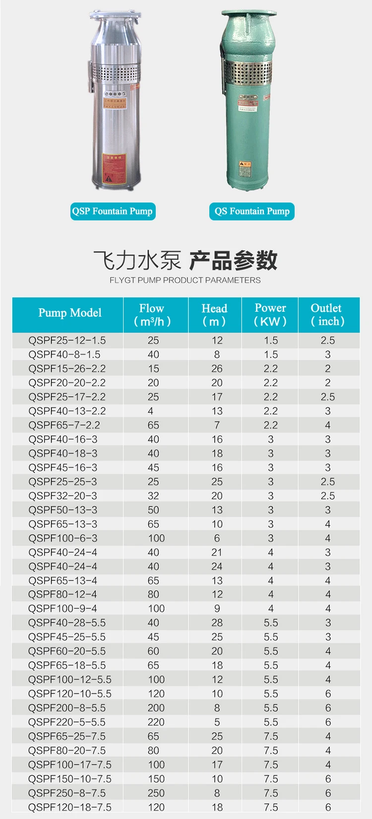 QSP fountain pump body, wet parts and external spare parts are made by cast iron or stainless steel, the motor is made by 100% copper wire. QSP fountain pump are mainly for square fountains, garden fountains, villa fountains, aquaculture areas etc., also widely used for farm irrigation.drip irrigation, or water supply and drainage treatment.