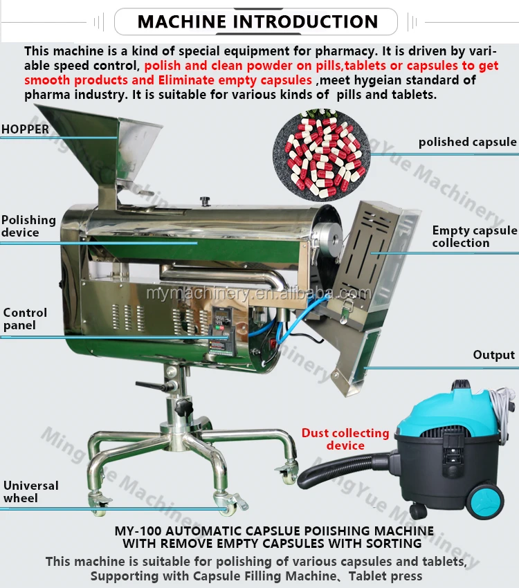 This product is a novel pharmaceutical special equipment. It is driven by a continuously variable transmission motor. Can polish and clean the dust attached to capsules and tablets, and improve the surface finish of pharmaceuticals, pharmaceutical industry to achieve health standards. This machine is suitable for polishing of various capsules and tablets