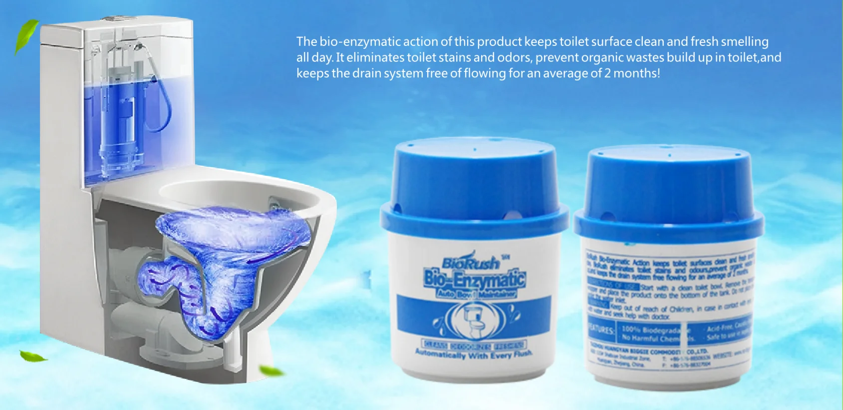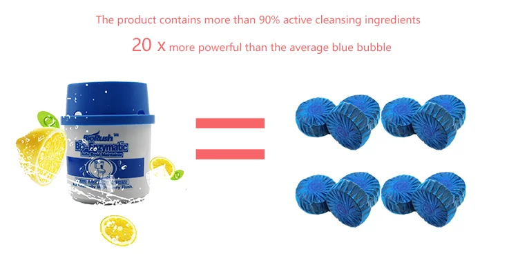 1. 100% biodegradable, acid-free, non-corrosive chemical free 2. Lasts up to 1200 flushes for an average 2 months usage at home 3. Contains billions of bacterium, it cleans, deodorizes, freshens automatically with every flush, 100% natural cleaning products