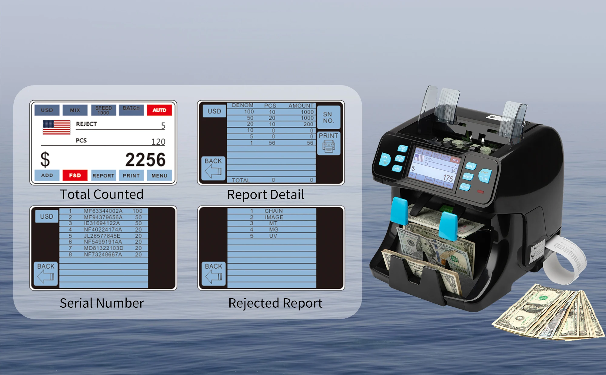 Counting speed | 800/1000/1200 notes/min |