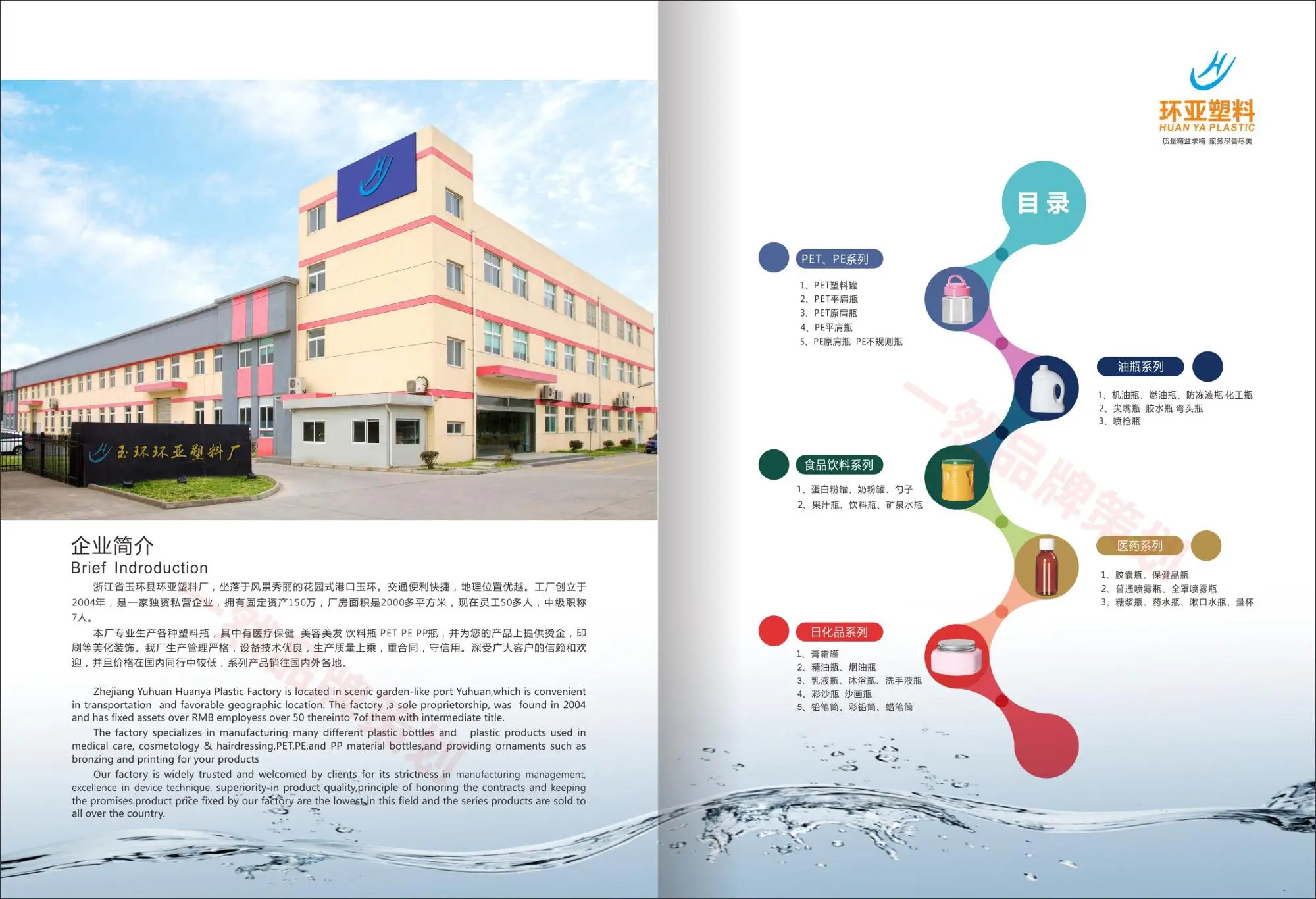 Established in 2004, Yuhuan Huanya Plastic Industry Co., Ltd. is a professional manufacturer and ecporter that is concerned with the design, development and production of plastic bottles. We are located in Taizhou Yuhuan, with convenient transportation access. All of our products comply with international quality standards and are greatly appreciated in a variety of different markets throuthout the world. Covering an area of 7000 square meters, we now have over 50 employees, and annual sales figure that exceeds 800 million and are currently exporting 30% of our production worldwide. Oue well-equipped facilties and excellent quanlity control throughout all stages of production enables us to guarantee total customer satisfaction. Besides, we have received ISO9001. If you are interested in any of our products or would like to discuss a custom order, pls feel free to contact us. We are looking forwarder to forming successful busniess relationships with new clients around the world in the near future.