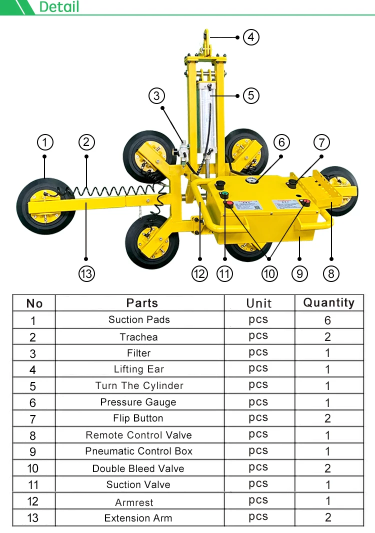 Product&Model | Dimension | Suction Pad dia | Suction Pad qty | Air Pressure | Control Mode | Safety Loading | Function | |||||||