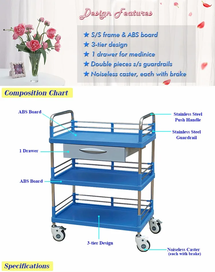 Name | Cheap price Hebei factory hospital use 3 tiers abs plastic medical treatment trolley cart with drawer |