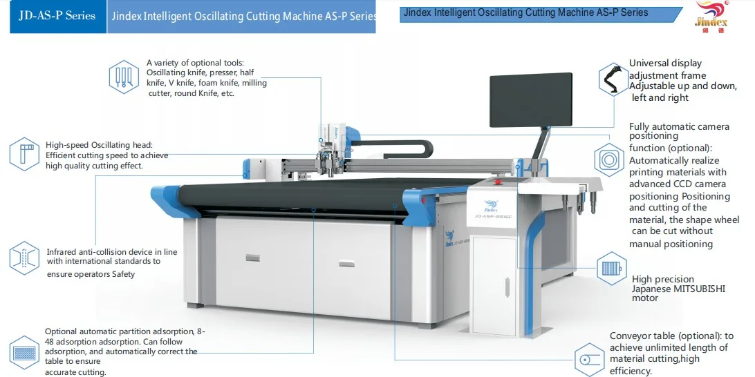 1.A veriety of optional tools: Oscillating Knife , presser, half knife, V knife, foam knife, milling cutter, round knife, etc.