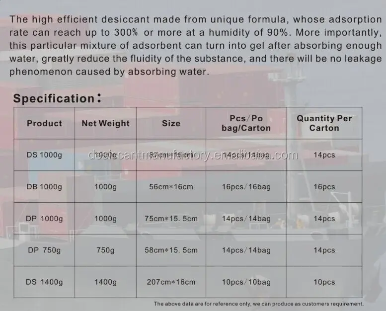 Container Desiccant are used for absorbing moisture. To keep proper humidity in a sealed environment to protect cargo from mold, Calcium Chloride desiccant is widely used in the storege of garments, bags, food, medicine, toys, woodworks, instruments, electronic products etc.