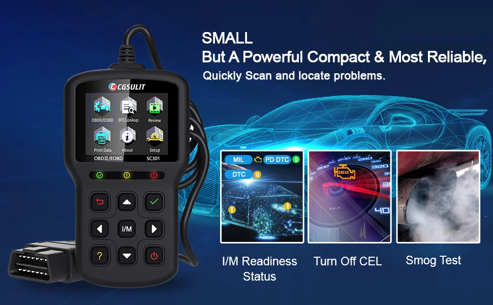 Carry-on Vehicle CEL Doctor The SC301 mini obd2 scanner can retrieve VIN and read DTCs of your vehicle automatically, read live data streams accurately and show clearly in text and graph format data, locate bad O2 sensors in time. One key I/M readiness for quickly check the emission system to ensure vehicles pass smoke check, turn off CEL (check engine light) or MIL (Malfunction Indicator Lamp), reset monitor.