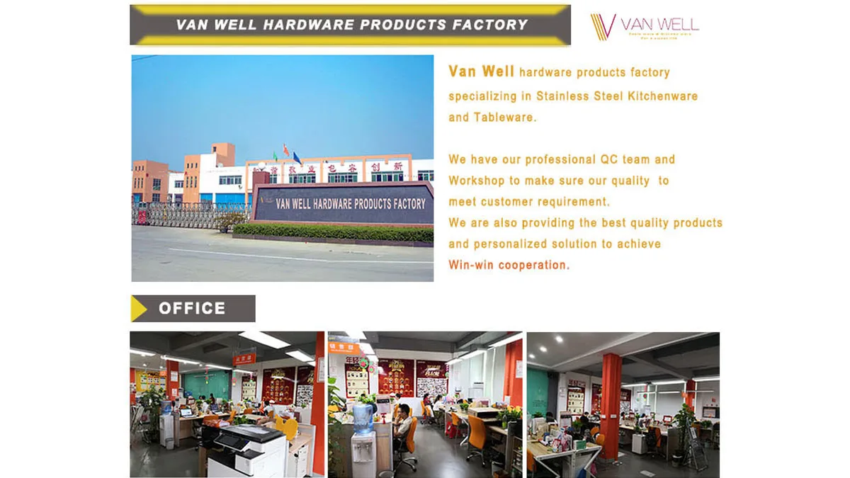 15 years only to do one thing: focus on stainless steel tableware and kitchenware! Van Well is located in Chaoan caitang town, Guangdong province, with more than 10,000 square meters of production workshops and 2,000 square meters of storage warehouses
