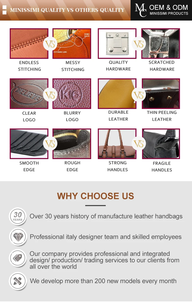 - Over 30 years history of manufacture leather handbags - Professional italy designer team and skilled employees - Our company provides professional and integrated design/ production/ trading services to our clients from all over the world - We develop more than 200 new models every month