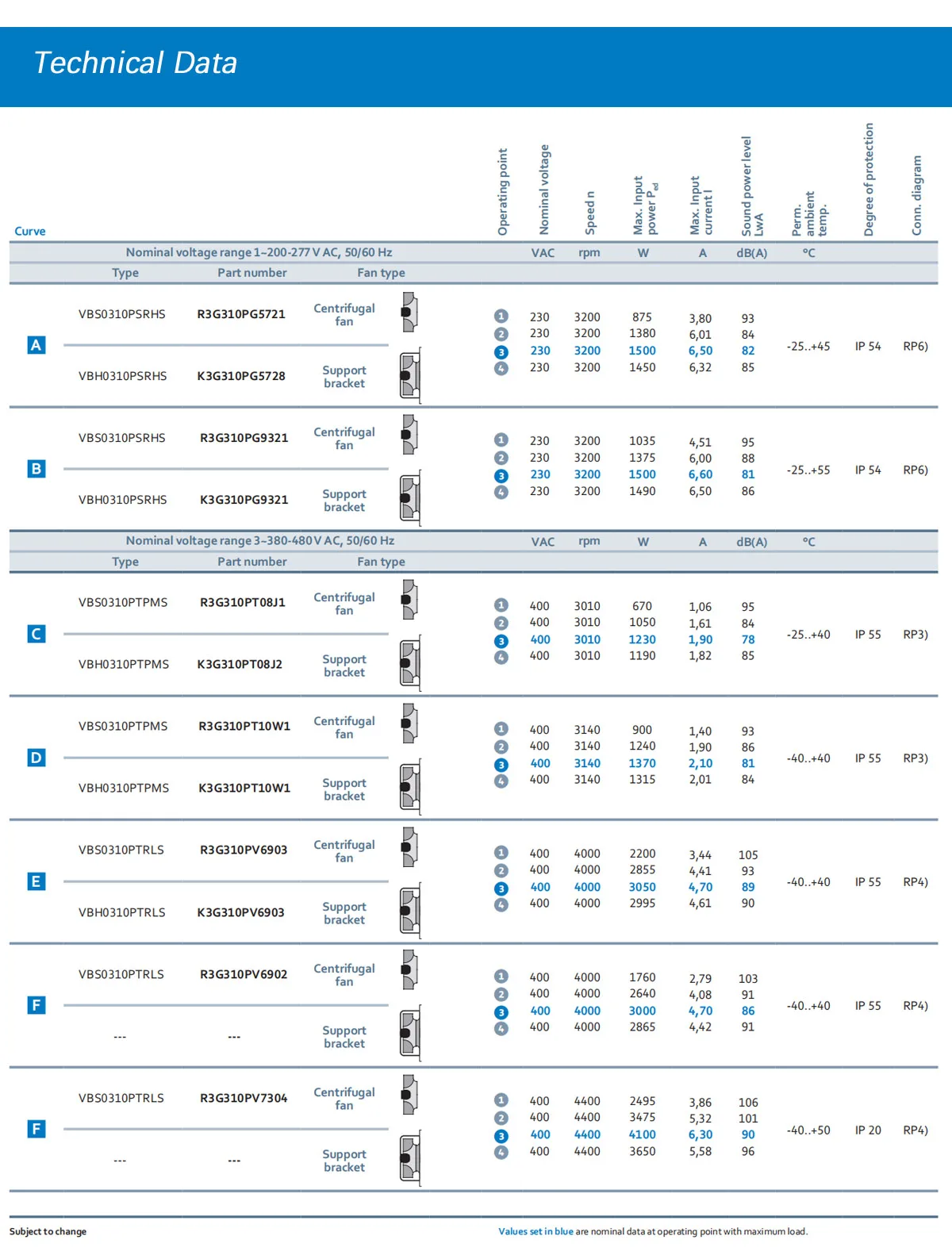 Number of blades:5 Direction of rotation: Clockwise viewed toward rotor Installation position: See product drawing Condensation drainage holes: Rotor side Mode:Continuous operation (S1) Mounting: Maintenance-free ball bearings | ||||||||