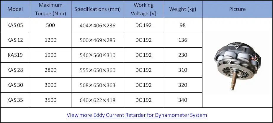 KA series air cooled eddy current dynamometer retarder is designed based on the domestic automobile testing equipment. Our Retarder brake torque ranges from 500N.m ~ 3800N.m. Welcome to contact us for more information about our dynamometer retarder list and prices. We supply DC24V, 48V, 96V,192V retarders for options.