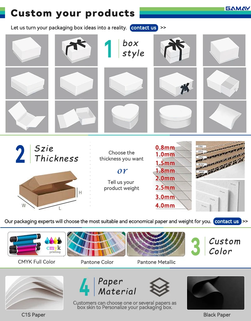 Box Type | 1.Lid & Base Structure,almost for every kinds of products; 2. flip lid box 3.drawer box 4.magnet box 5.round tube box 6.window box 7.foldable box 8.suitcase box | |||||||||||
