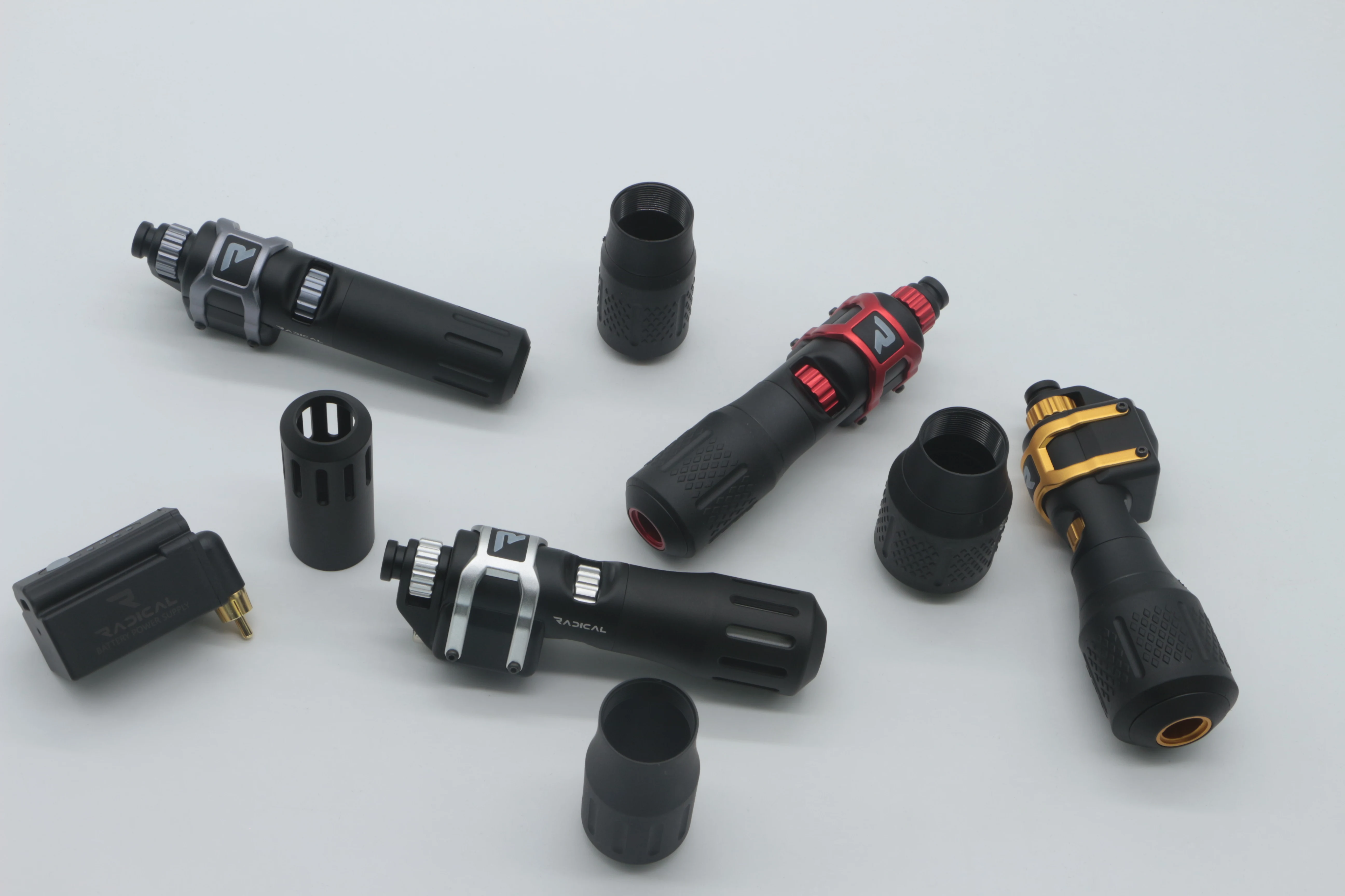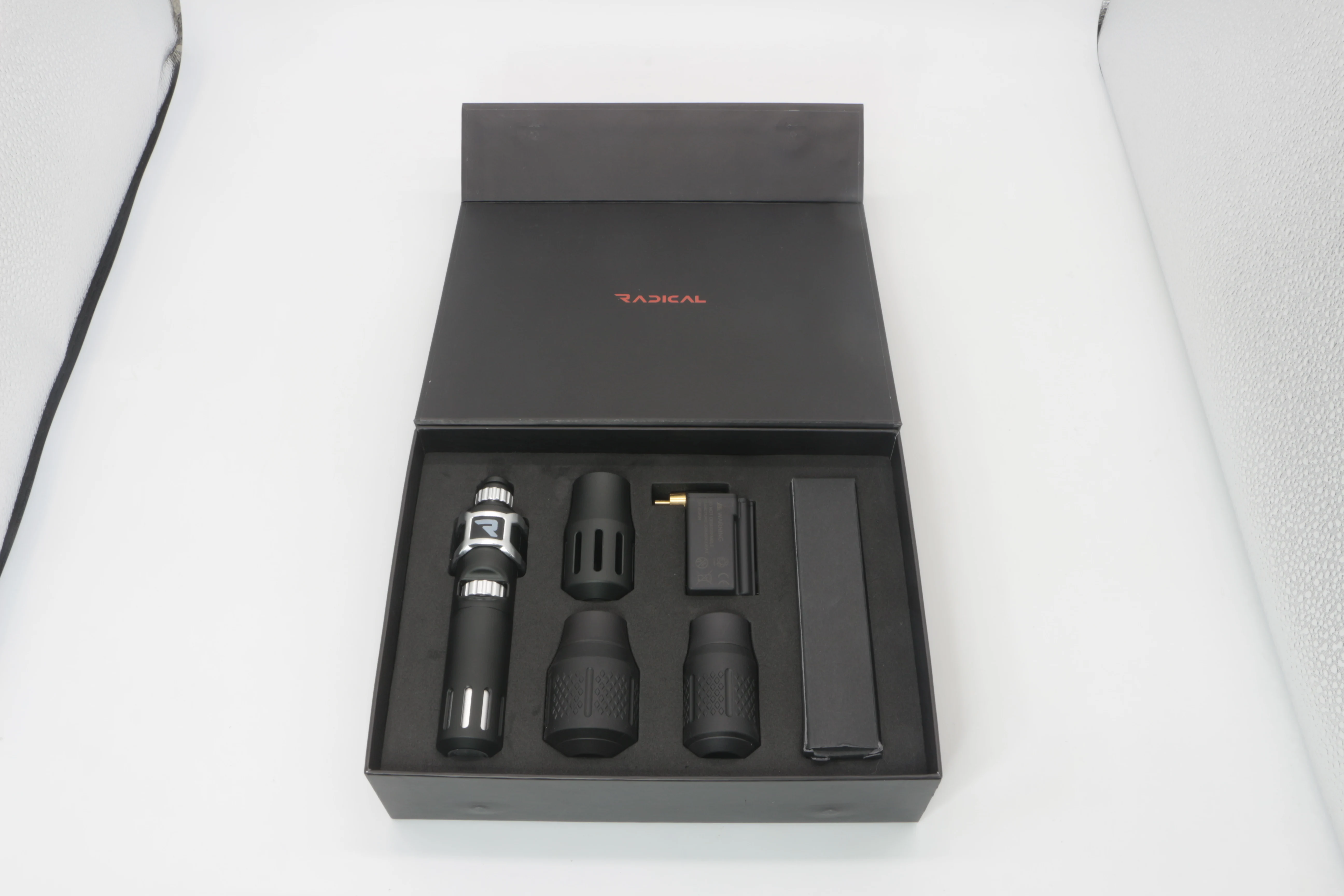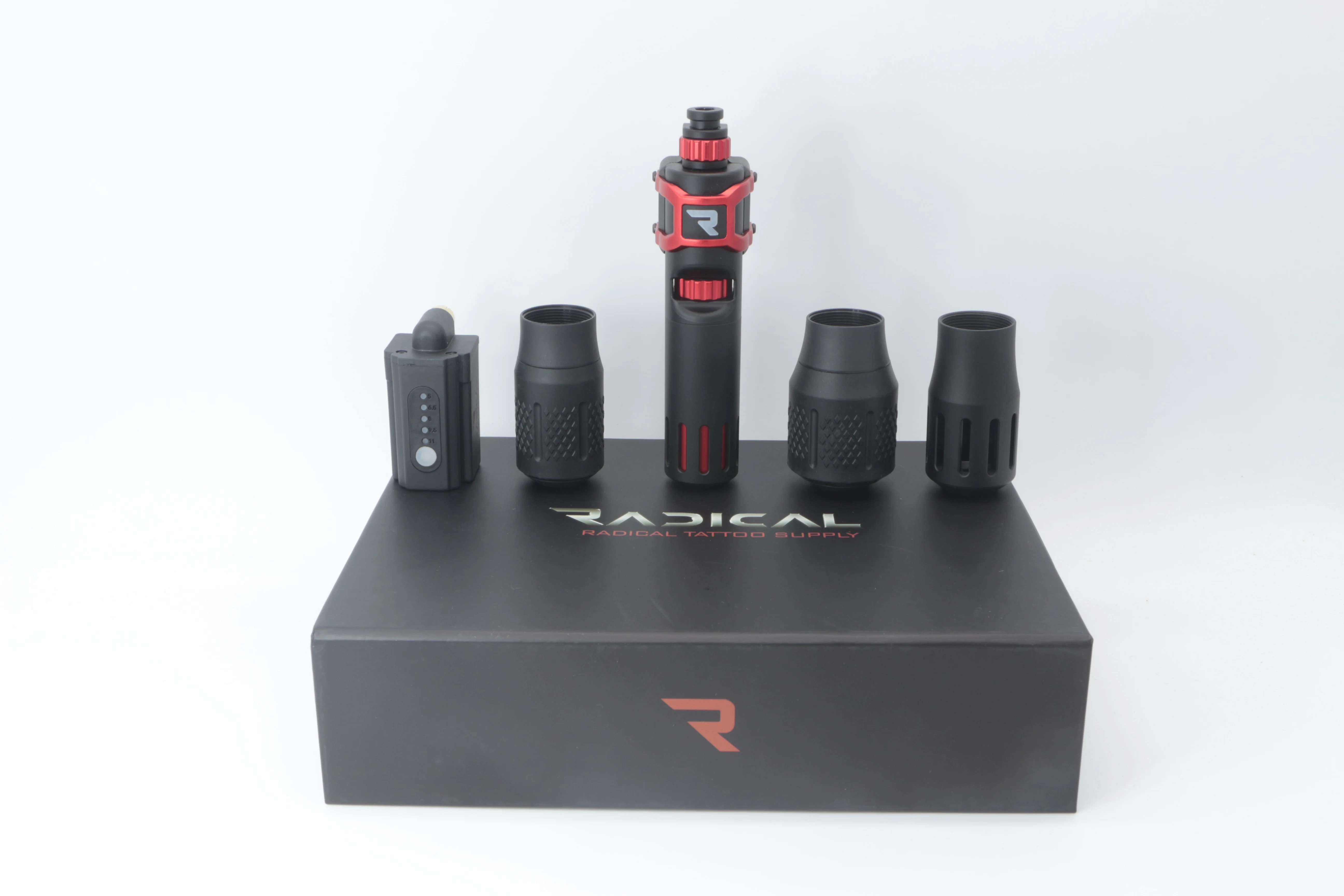 The Radical Pen comes in a set includes: 1 Pen, 4 Grips(1" Inch Grip, 1.25" Inch Grip, 1.25" Inch Textured Grip, & 1.5" Inch Textured Grip), 1 Wireless Power, RCA Cord, and Charge Cord for power.