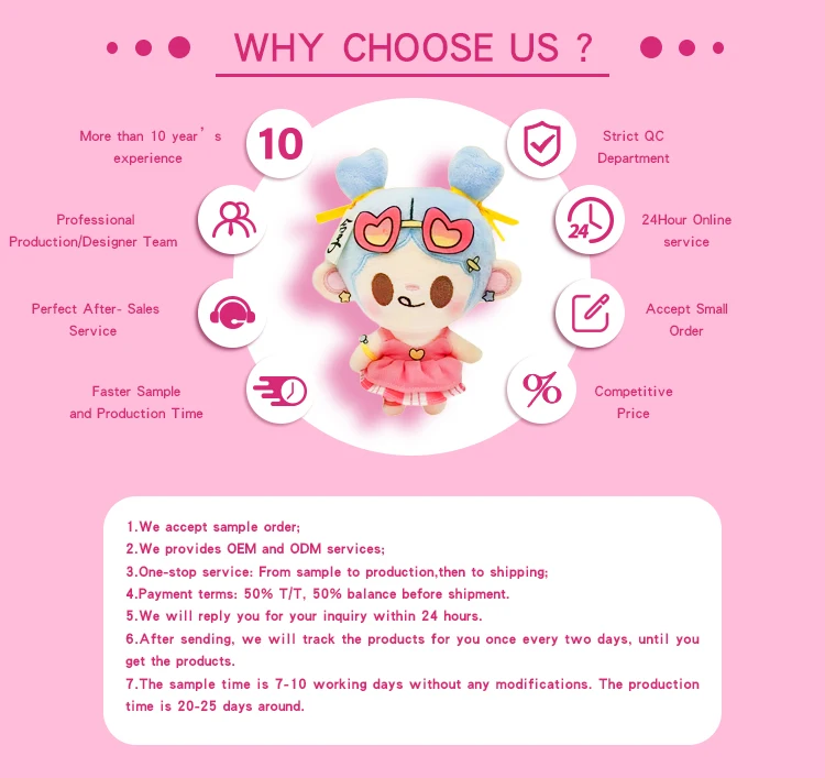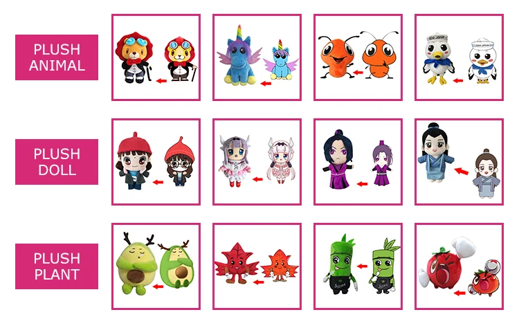 Custom Service | We could custom plush toys for you as your requirement with MOQ 50 pcs. |