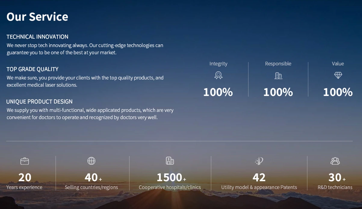 Wuhan Dimed Laser Technology Co., LTD. is a national high-tech manufacturer and supplier of medical laser systems engaged in surgical and therapy laser equipment R&D, producing, marketing, sales and services. On the strenght of our over 20 years of experience, Dimed has gradually become the leader in medical laser field in China. In global market, Dimed brand stands for: Advanced Technology High Performance Reliability Safety Dimed Laser has estaslished a complete medical laser system integrating dental laser, ENT laser, physiotherapy laser therapy, aesthetic beauty laser, veterinary laser, PLDD / EVLT, Podiatry laser, and so on. Currently we have four dedicated R&D teams to bring new tech to this industry: electronics, structure design, software design and safety regulation engineer team, 10-year experienced technicians takes 50% proportion, leading team in Chinese medical laser industry. We will continue to work hard in order to achieve the goal of "building a global brand of professional medical laser". Thank you for your always support!
