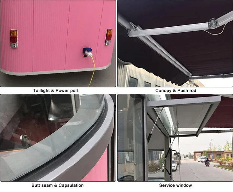 1. Body Material: 50mm polyurethane Sandwich plate material with intermediate heat insulation plate,Any logos is available.Any color is available. 2. Chassis and Frame: Integral steel frame construction and suspension components treated with rust resistant protective coating. 3. Wheels: Tires with axles. 4. Tow-bar: High Strengthen durable AL-KO axle with safety ball headed coupling. 5. Flooring: Non-slip flooring Aluminum Corrugated plate with drain, easy to clean up.